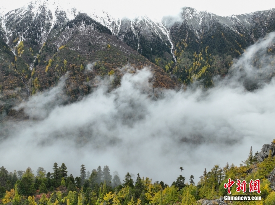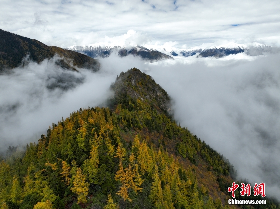 10月26日,航拍西藏多雄拉雪山,雪山與層林盡染的森林組成一幅壯美的秋日高原畫卷。西藏林芝多雄拉雪山位于喜馬拉雅山脈北段主脊,曾是徒步進(jìn)入墨脫縣最艱險(xiǎn)的路段之一。(無人機(jī)照片) 中新社發(fā) 董志雄 攝