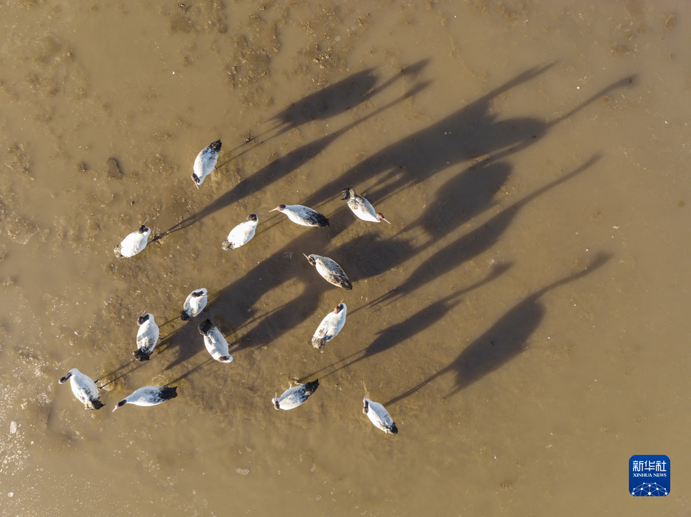 拉薩市林周縣卡孜水庫拍攝的黑頸鶴(3月1日攝,無人機(jī)照片)。新華社記者 孫非 攝