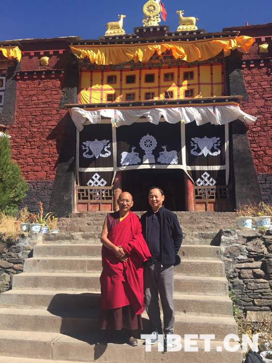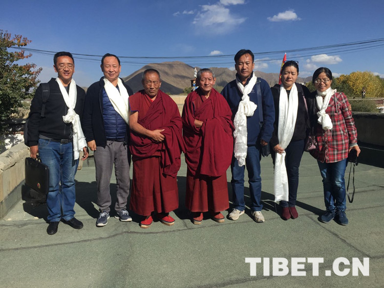 圖為豆格才讓?zhuān)ㄓ乙唬┰诓貐^(qū)調(diào)研時(shí)與僧人合影