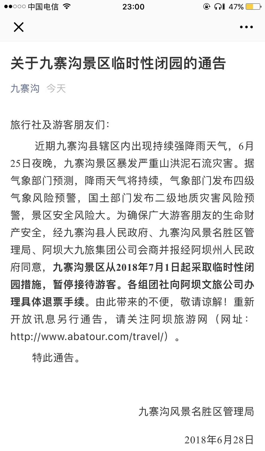 中國西藏網(wǎng)訊 6月28日晚,九寨溝風(fēng)景名勝區(qū)管理局在其官微發(fā)布題為《關(guān)于九寨溝景區(qū)臨時(shí)性閉園的通告》稱,因天氣原因造成景區(qū)風(fēng)險(xiǎn)大,九寨溝景區(qū)從2018年7月1日起采取臨時(shí)性閉園措施,暫停接待游客。