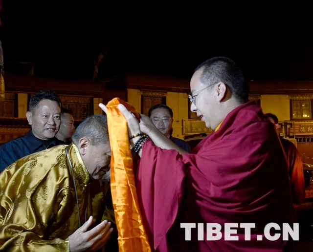 十一世班禪乘車抵達(dá)大昭寺時(shí)法號(hào)齊鳴、鼓樂喧天。早已迎候在此的中國(guó)佛協(xié)西藏分會(huì)會(huì)長(zhǎng)珠康?土登克珠向十一世班禪敬獻(xiàn)哈達(dá),表達(dá)僧眾對(duì)他的衷心擁戴。