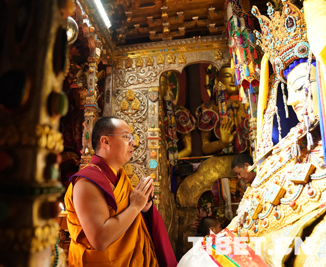 朝拜結(jié)束后,十一世班禪登上設(shè)在釋迦牟尼佛像正對(duì)面的寶座上,面朝佛像,帶領(lǐng)眾僧念誦經(jīng)文,祈愿五谷豐登、國(guó)泰民安、世界和平。