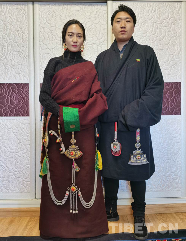 索南旦周最小的女兒叫梅朵,今年23歲,“梅朵”漢語意為“花朵”,她和她的名字一樣漂亮。她是索南旦周家里識文斷字的人。她的老公尕瑪才丁人高馬大,是典型的康巴漢子,他電大畢業(yè)后自主創(chuàng)業(yè),選擇靠祖?zhèn)鞯慕疸y首飾、佛像制造安身立命,在結(jié)古地區(qū)小有名氣。他打制的金銀首飾,精工細作,一絲不茍,真材實料,信譽度很好。他們主要接廠家和散戶訂制。梅朵兩口子不善言語,而他倆一帥一美,藏裝上佩戴各式自己打制的金銀裝飾品,是最好的語言和廣告。(中國西藏網(wǎng) 通訊員/才仁當智)