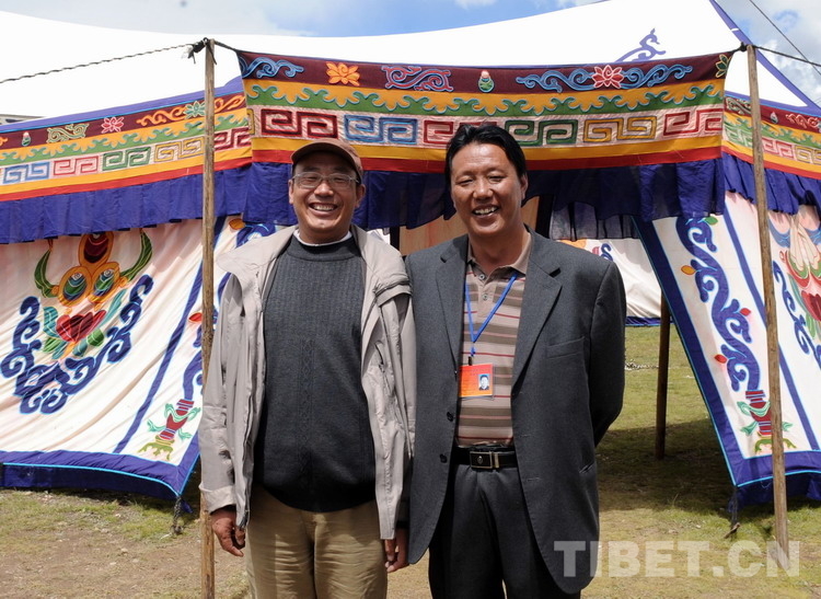 這是唐召明(左)與時任那曲縣縣長扎南(右)在那曲賽馬會的帳篷前合影留念(唐召明提供,2009年8月12日攝)