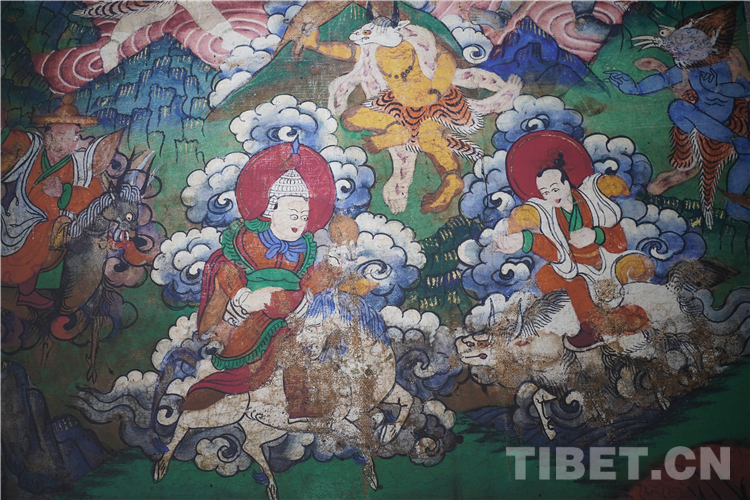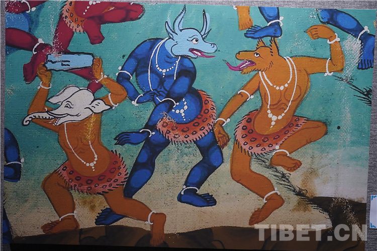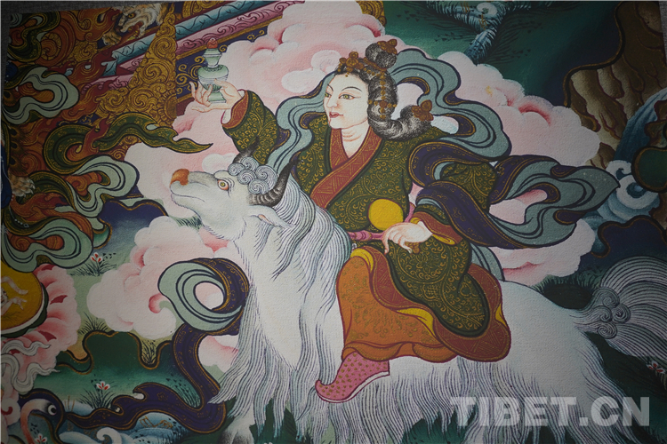展廳中還有一副遠(yuǎn)看非常另類,細(xì)細(xì)欣賞漢藏繪畫風(fēng)格交流交融的作品,那是一幅四川省阿壩藏族羌族自治州金川縣墨爾多神山壁畫的局部作品。東智先生說:“這幅局部畫作從發(fā)髻、服飾等多個方面充滿了漢族風(fēng)格,甚至人物穿的還是漢服,座下是像馬一樣的牦牛,但是手上掄著古朵(古朵指的是用牦牛毛或者山羊毛編織成的拋石繩,可以將石頭投擲到較遠(yuǎn)的地方,是牧民們用來放牧的工具),非常有辨識度,充滿藏族文化特色?!?/p>