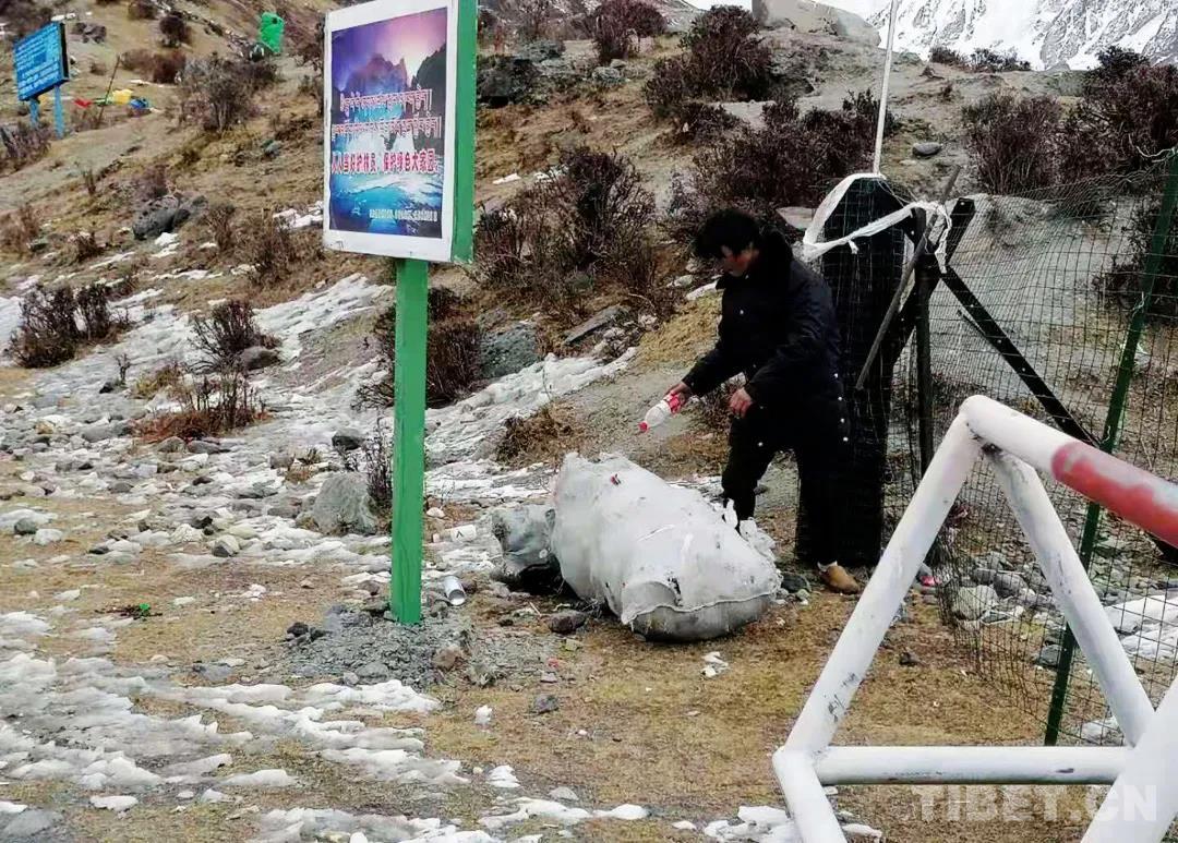 圖為巡邏隊(duì)成員在薩普冰川清理生活垃圾