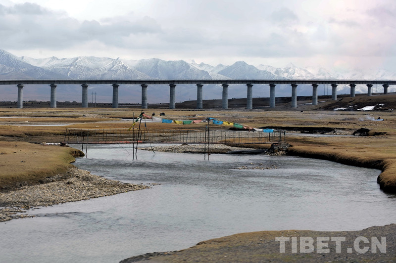 藏北高原,在藏語(yǔ)里稱為“羌塘”。這里棲息著的藏羚羊,每年春夏季都會(huì)大規(guī)模由南向北長(zhǎng)距離遷徙,五道梁至楚瑪爾河一帶是必經(jīng)之路。為了保證藏羚羊自由遷徙,青藏鐵路在這里設(shè)立了四處野生動(dòng)物通道。其中長(zhǎng)11.7公里的清水河特大橋和長(zhǎng)4公里的楚瑪爾特大橋,采取“以橋代路”形式設(shè)計(jì)動(dòng)物通道,供野生動(dòng)物通過(guò)。