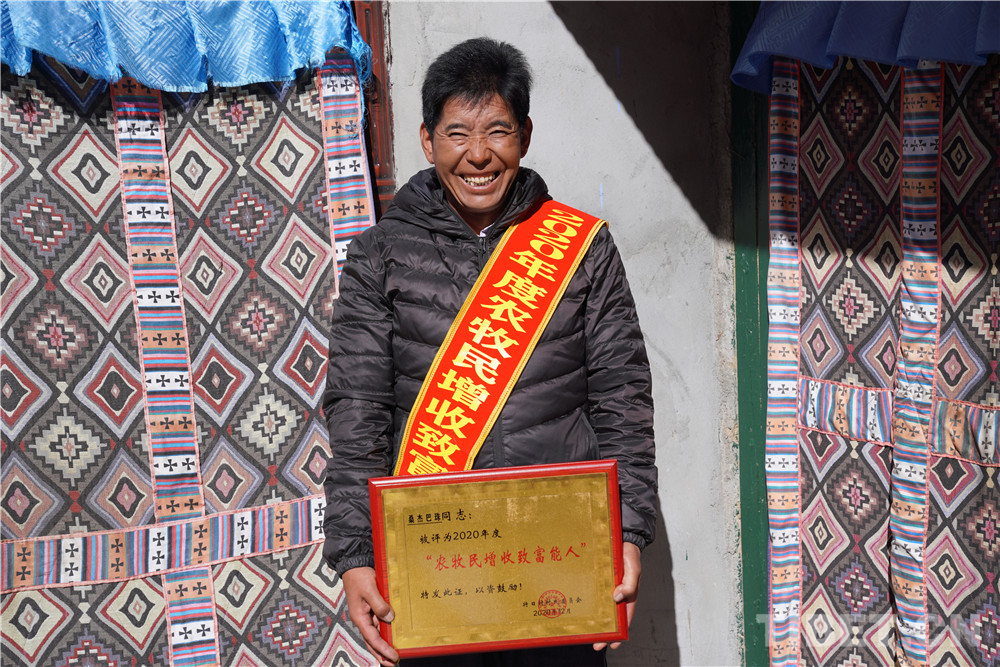 勞動致富的桑杰巴珠。他曾經(jīng)是享受國家補助的一般貧困戶。為了早日摘掉貧困帽子,自2019年開始,他先后貸款5萬元購買拖拉機,在工地上搞運輸;參加了涂裝工、抹灰工培訓班,以技術求創(chuàng)收;在拉薩、澤當承包工地人工。艱辛的努力收獲了香甜的碩果,如今的桑杰巴珠日工資最低300元;2020年帶動本村12人就業(yè),共創(chuàng)收達48萬多元。他的大女兒米瑪卓瑪于2018年考上了湖北理工學院漢語文專業(yè),小女兒拉巴曲珍考上了山南完中,曾經(jīng)的困難戶華麗轉身成為小康人家。
