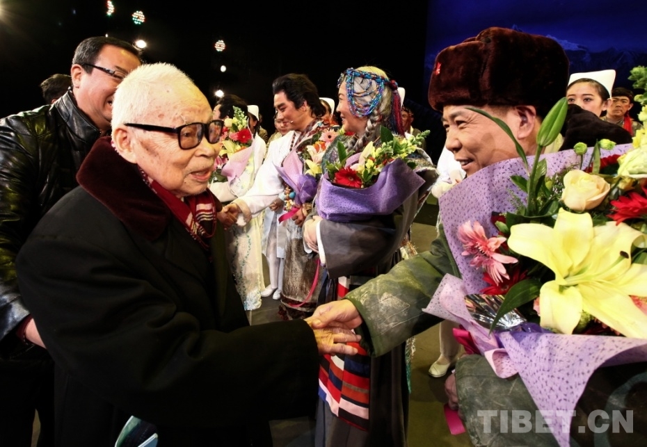 圖為北京建藏援藏工作者協(xié)會學(xué)習(xí)指導(dǎo)老師陰法唐將軍在中國評劇院所創(chuàng)作的評劇《藏地彩虹》試演結(jié)束后,上臺握手祝賀(唐召明2017年12月10日攝)