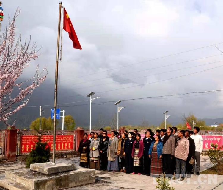 圖為稅收干部和當(dāng)?shù)厝罕娫谖鞑刈灾螀^(qū)日喀則市吉隆鎮(zhèn)達(dá)曼村開(kāi)展升國(guó)旗儀式