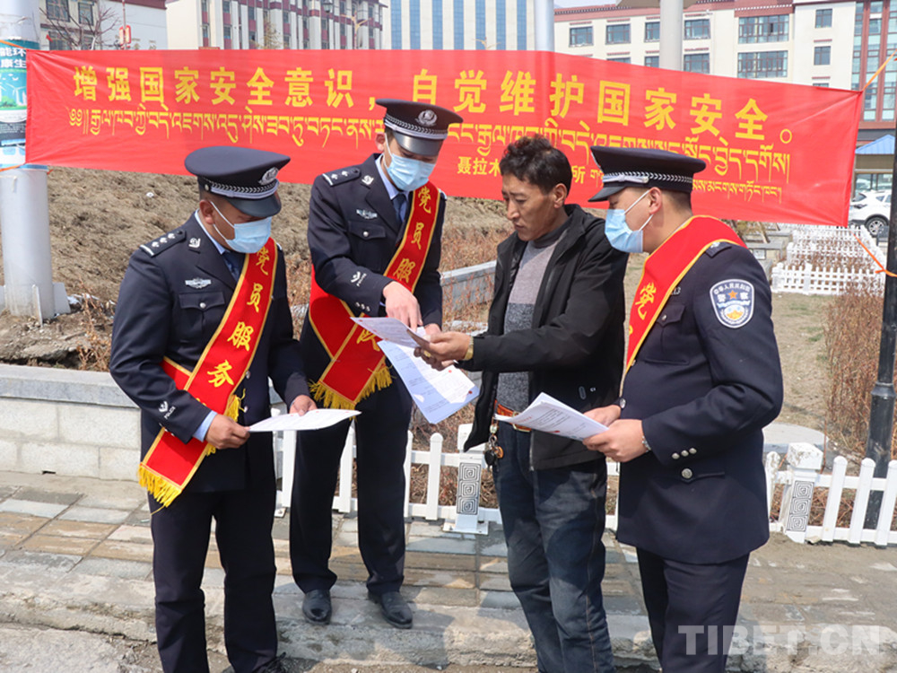 “12339,是國家安全機關受理公民和組織舉報電話。這條熱線是由國家安全部設立的,為了方便公民組織向國家安全機關舉報行為或線索?!痹谖鞑厝湛t市的街頭,日喀則邊境管理支隊民警達娃卓嘎為過往群眾講解“全民國家安全日”的相關知識。