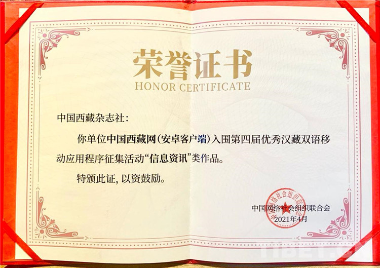 圖為中國(guó)西藏網(wǎng)的獲獎(jiǎng)榮譽(yù)證書