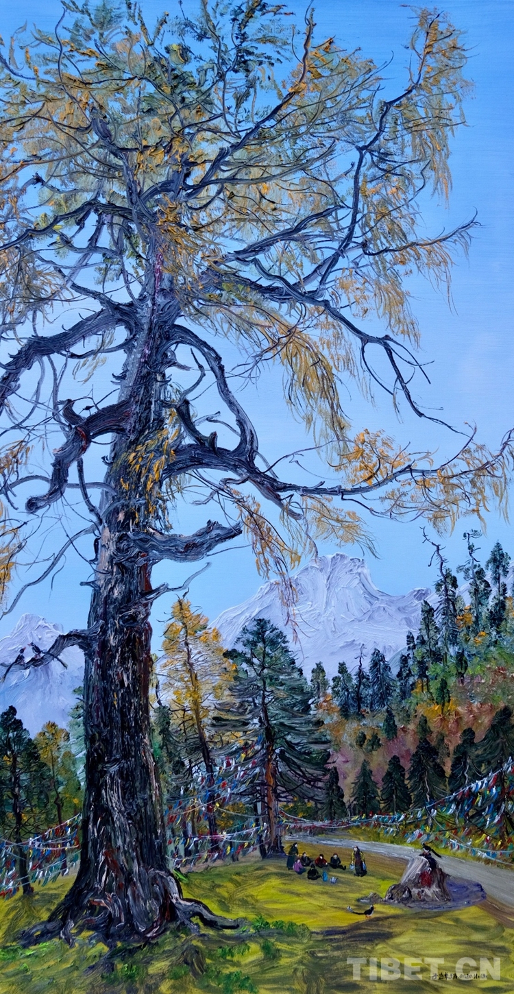 “展覽的油畫創(chuàng)作大多是在寫生現(xiàn)場(chǎng)完成的,她的藝術(shù)風(fēng)格也清新生動(dòng)。她以自己的寫生作品,令觀眾共享融入自然的至純大美,這是一種平易近人的審美方式?!眹?guó)家一級(jí)美術(shù)師余有心評(píng)價(jià)說(shuō),子白特別善于畫樹,她的一幅幅佳作就是這些千年古樹的肖像,借審美而參悟自然生態(tài)的奧妙,帶觀眾領(lǐng)會(huì)高原生態(tài)文明之真諦。