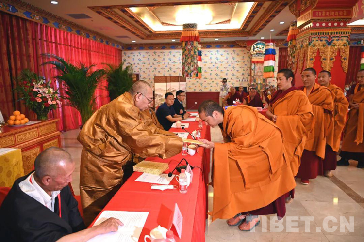 圖為中國佛教協(xié)會副會長、藏傳佛教學(xué)銜工作指導(dǎo)委員會主任、中國藏語系高級佛學(xué)院院長嘉木樣活佛向?qū)W員頒發(fā)學(xué)銜證書