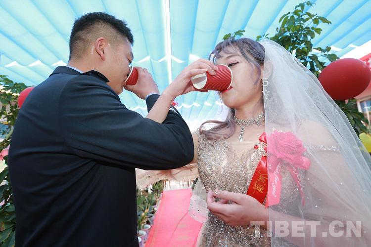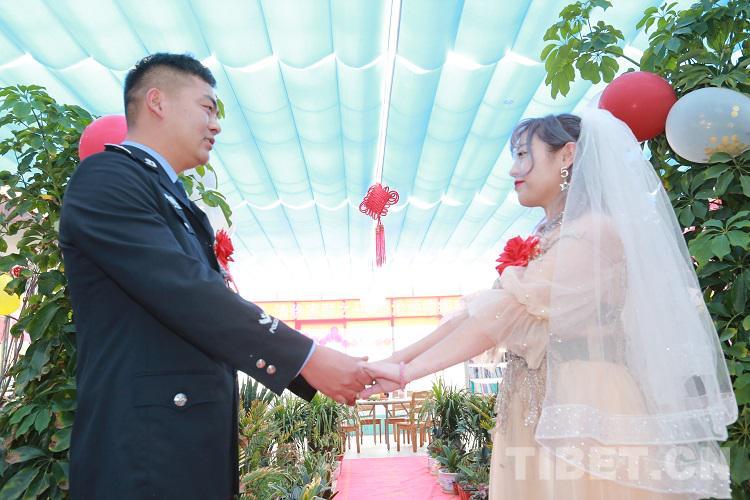 沒有鋪張豪華的迎親車隊(duì),沒有山珍海味的結(jié)婚宴席,大家在陽關(guān)房里鋪上紅地毯、掛上彩色氣球,用鮮花和彩帶巧手裝點(diǎn)禮堂。繽紛的喜字掛在墻上,讓平日里莊嚴(yán)肅穆的營區(qū)變成了另一番景象,讓新娘感受到了只有警嫂才有的至高禮遇。藏青藍(lán)與婚紗白交融,浪漫與忠誠在海拔4300米演繹著動(dòng)人的交響曲。