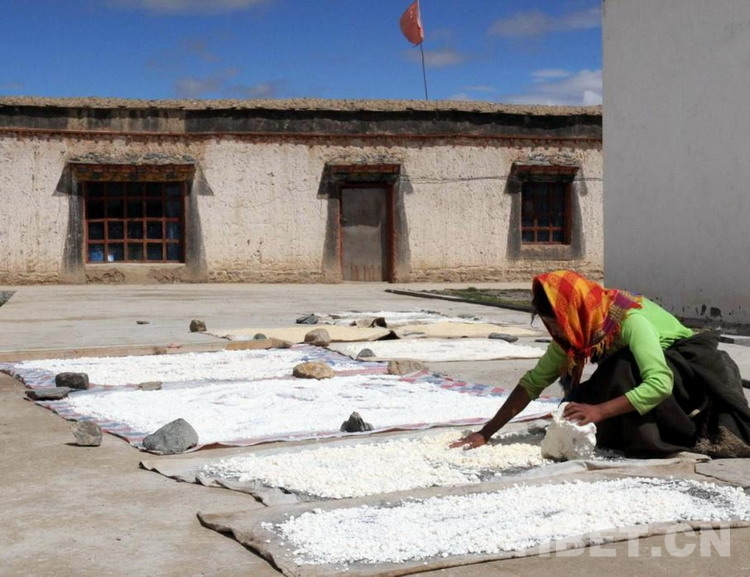 我發(fā)現(xiàn),這里的專業(yè)合作經(jīng)濟(jì)組織在遼闊的草原上發(fā)揮了很大作用。分離酥油生產(chǎn)間里,4位年輕的婦女在臉盆粗的牛奶木桶上,雙手握著木桿式活塞一上一下地打牛奶,分離酥油;一位年老的婦女在房前水泥空地上攤曬奶渣;4位牧民在村莊后為幾十頭牦牛挨個(gè)擠牛奶,還有幾位婦女手拎橡膠桶,在草地上撿拾濕漉漉的牛糞,然后倒在草地上,再用手?jǐn)偝梢粋€(gè)個(gè)牛糞餅曬干,最后摞成牛糞垛,作為冬季取暖的燃料……大家分工明確,各司其職。