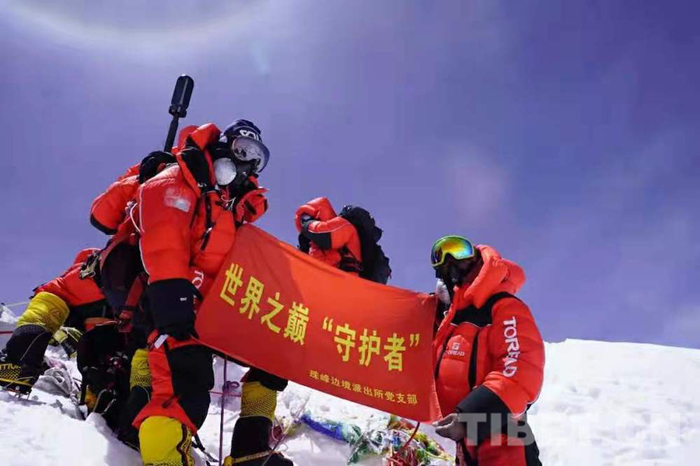 圖為登山隊(duì)員在珠穆朗瑪峰展示珠峰邊境派出所黨建品牌