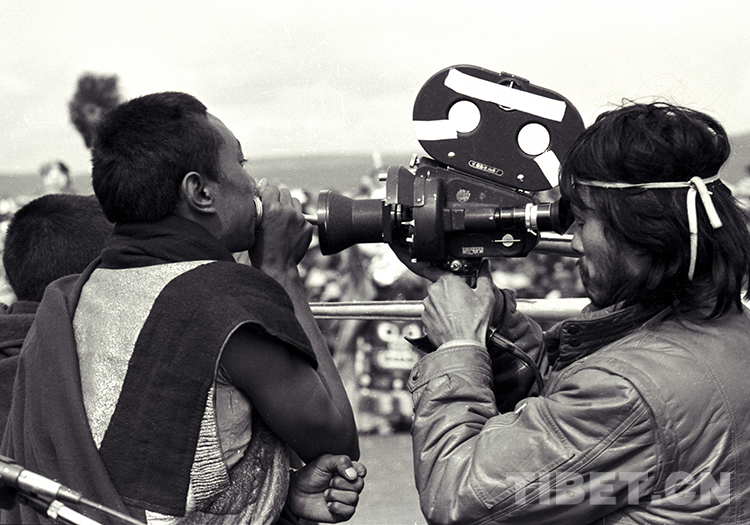 這是北京科學(xué)教育電影制片廠《萬里藏北》攝制組在那曲賽馬會(huì)上拍攝吹長(zhǎng)號(hào)的僧人(唐召明1987年攝)