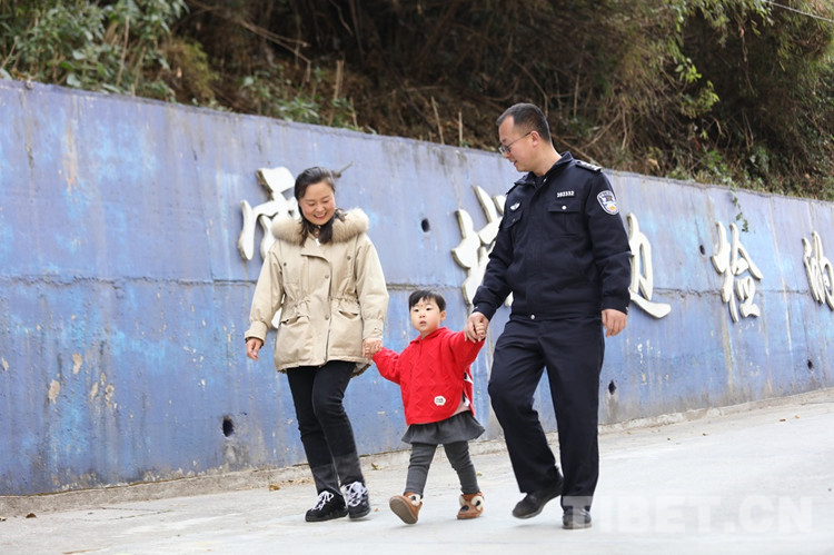 圖為薛鵬飛正迎接愛人和孩子回單位里 攝影:尼瑪云丹