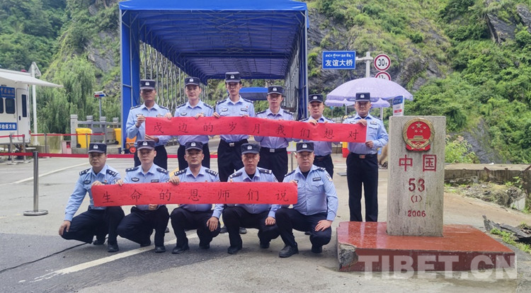 圖為友誼橋執(zhí)勤點(diǎn)全體民警在界碑前對(duì)自己的恩師“表白” 攝影:尼瑪云丹