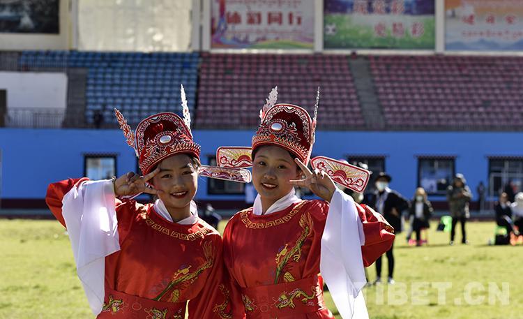 臨時的化妝間里,畫好妝容的學生們漸次走出,準備候場。索朗曲珍和白瑪曲吉臉上沒有一絲緊張的表情。正上高二的她們,學習黃梅戲已經(jīng)有一段時間了,為了即將到來的演出,也已練習許久。