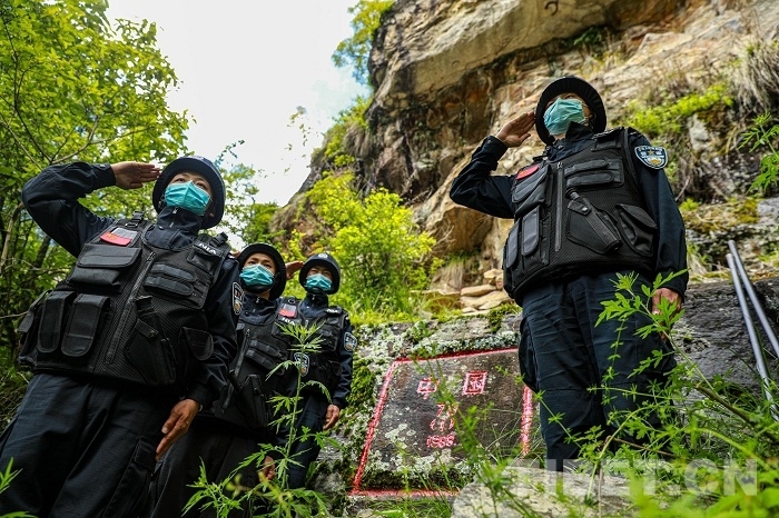 圖為?2020?年?7?月?16?日 陳塘邊境派出所民警為界碑描紅后向祖國(guó)敬禮