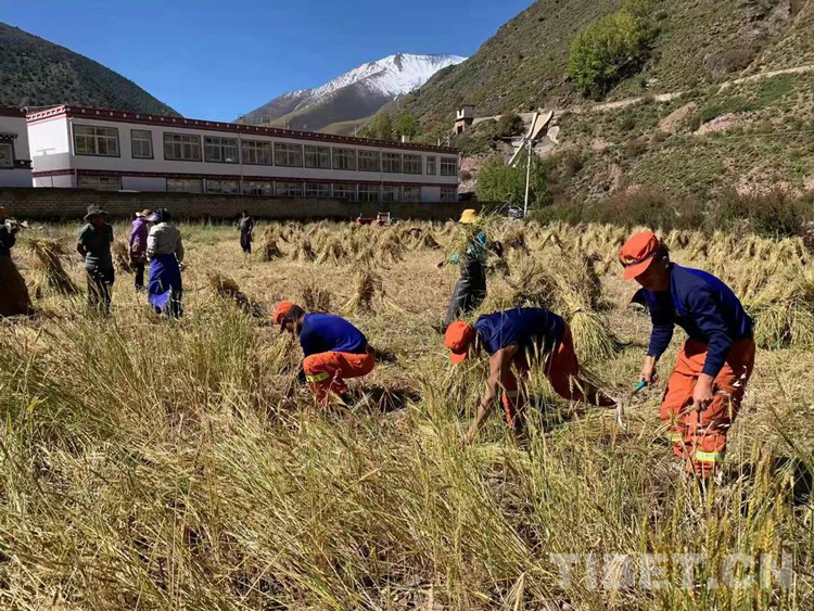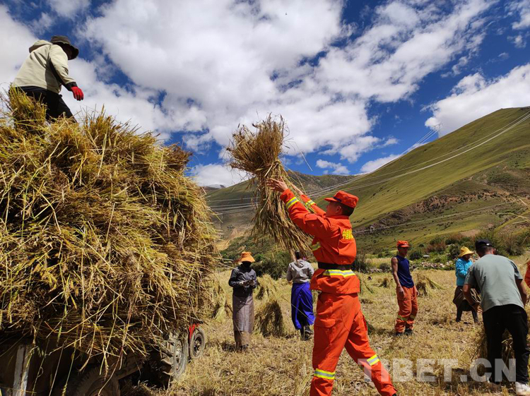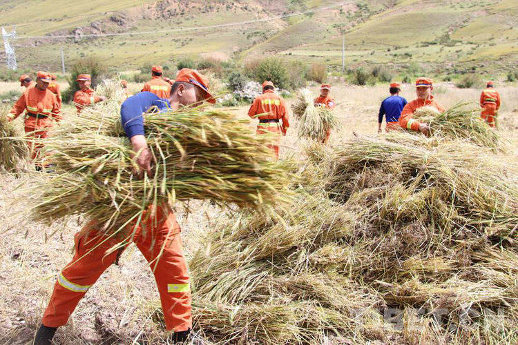 圖為消防員們正在幫助村民收割青稞