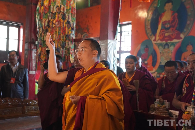 在每所寺院開展佛事活動(dòng)時(shí),班禪按宗教儀軌向僧眾發(fā)放布施、供齋茶、齋飯,同時(shí)關(guān)切詢問僧人的學(xué)經(jīng)、修行、生活等情況。班禪在講經(jīng)、闡釋教義的同時(shí),多次勉勵(lì)僧眾要適應(yīng)人民群眾向往追求的方向,講好經(jīng),傳好法,做合格僧尼。言傳身教、以身作則,引導(dǎo)寺廟僧尼和信教群眾正信正行。