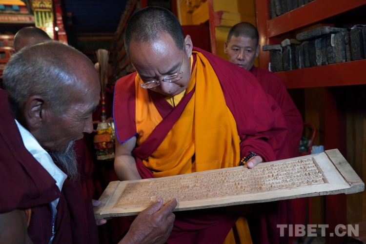 隨后班禪參觀了寺院的印經(jīng)院,納塘寺印經(jīng)院被譽(yù)為“西藏文庫”。曾刻制印刷大量的藏文經(jīng)典著作。其中包括大藏經(jīng)《甘珠爾》108部、《丹珠爾》225部,都是完整的精刻版,除文字外還有套色版畫。此套印版的首次印刷本現(xiàn)珍藏于扎什倫布寺和布達(dá)拉宮。
