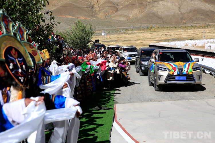沿途農(nóng)牧區(qū)的信教群眾聞?dòng)嵡皝?身著傳統(tǒng)節(jié)日盛裝、手捧潔白哈達(dá),隊(duì)伍綿延數(shù)里,虔誠迎候班禪的到來。每當(dāng)遇到前來迎接的信教群眾,班禪便示意車輛緩行,開窗向信眾揮手致意,氣度不凡又格外親切。