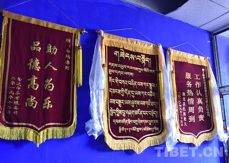圖為白瑪赤列的勞務派遣公司里大家贈送的錦旗 攝影:王媛媛