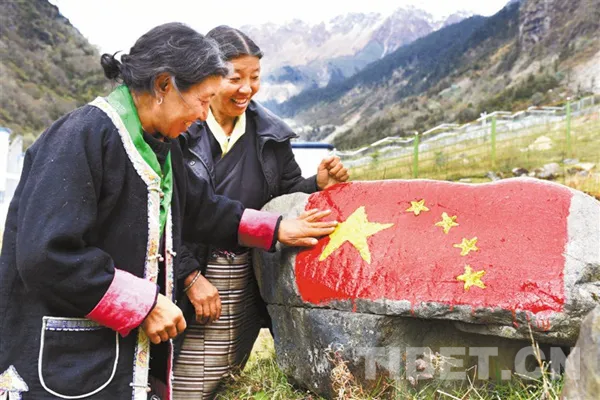 圖為卓嘎、央宗姐妹撫摸繪制在村口的五星紅旗