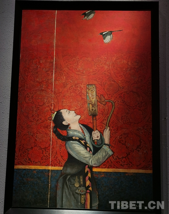 此次展覽共有39位藝術(shù)家的70多幅作品展。藝術(shù)家們在繼承西藏傳統(tǒng)的藝術(shù)形式上,利用西藏特殊元素引入各種畫種之中,并引入新的題材,讓其變得十分廣泛,同時(shí)也融合了油畫、水墨畫、水彩、雕塑等。