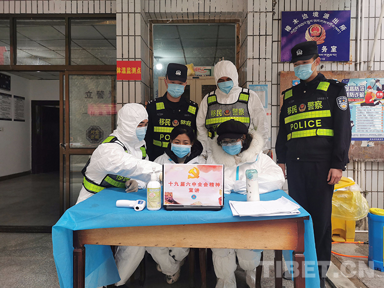 圖為樟木邊境派出所第三警務室執(zhí)勤民警與口岸醫(yī)院醫(yī)護人員共同學習十九屆六中全會精神