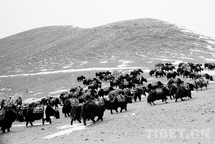 這是馱鹽隊(duì)牧民趕著成群馱牛前往藏北無人區(qū)的鹽湖去馱鹽(唐召明1988年攝)