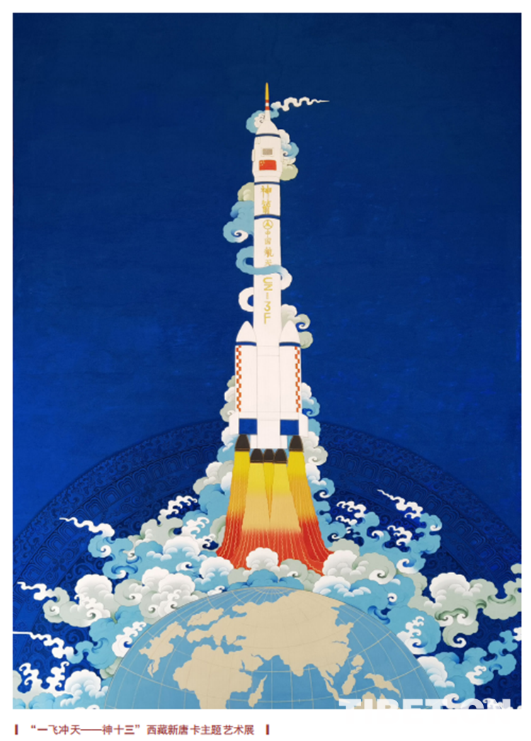 唐卡藝術(shù)家邊巴的新唐卡作品《一飛沖天》,以神舟十三號(hào)為主題,描繪了飛船沖出地球奔向星辰大海的瞬間。飛船、地球、祥云的后面,有一個(gè)融入背景的曼荼羅圖案,象征著西藏傳統(tǒng)的宇宙觀。傳統(tǒng)地道的勉唐派唐卡繪畫語言,采自天然礦物富有環(huán)保特征的厚實(shí)顏色,漢藏融合的審美品位,立足中國放眼世界的人類命運(yùn)共同體胸懷,正是新時(shí)代新唐卡新融合的藝術(shù)表達(dá)。