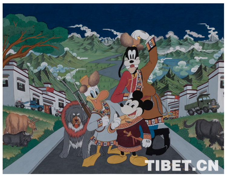 唐卡藝術(shù)家邊巴的新唐卡《逛新城》,同樣的青山綠水,同樣的社會(huì)主義新農(nóng)村,不同的是,他讓米老鼠和唐老鴨穿上藏裝來做客了。隨著拉薩近年來的城市巨變,知名企業(yè)、品牌進(jìn)駐城市,也以獨(dú)特的風(fēng)格資源和自身亮點(diǎn)成為旅游勝地,一個(gè)嶄新而充滿活力的現(xiàn)代化拉薩正在崛起。作品在傳統(tǒng)與現(xiàn)代之間所傳遞的沖撞與融合,展現(xiàn)的自信與從容,正是中華文化的主流價(jià)值所在。