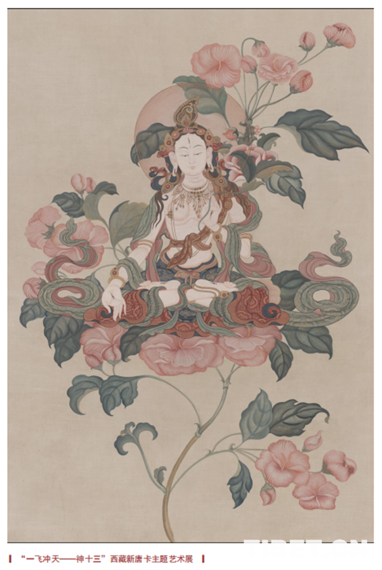 唐卡藝術(shù)家王天文所繪新唐卡《花與佛》則以女性特有的松活靈動(dòng),將工筆的花卉與白度母融合在一起,通過繪畫達(dá)成了新的意境……