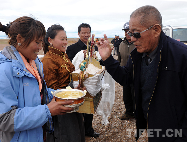 這是那曲地區(qū)雙湖特別區(qū)(現那曲市雙湖縣)的青年在向來訪的老領導洛桑丹珍敬青稞酒(唐召明2013年7月25日攝)
