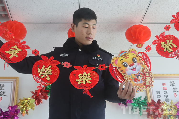 圖為日喀則邊境管理支隊(duì)昌果邊境派出所九年未回家過(guò)春節(jié)的民警郜曉占布置春節(jié)裝飾