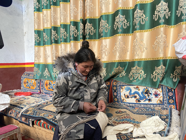 圖為江達縣卡貢鄉(xiāng)卡貢村白措在手工編制藏式腰帶
