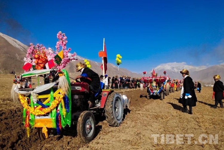 據(jù)悉,儀式當(dāng)日上午,村民們會(huì)身著節(jié)日盛裝,歡聚在田間地頭、載歌載舞隆重舉行春耕春播儀式。活動(dòng)現(xiàn)場,姑娘們舉起手中的切瑪、青稞酒、人參果為犁手們唱歌敬酒,在祝福的歌聲中,開啟春耕“第一犁”。在西藏,過去是牦牛耕地,如今,隨著農(nóng)業(yè)科學(xué)化發(fā)展,現(xiàn)在農(nóng)耕都用現(xiàn)代化的拖拉機(jī)“鐵牛”耕地。一般吉時(shí)一到,一個(gè)個(gè)犁手頭頂金黃圓筒帽,身穿氆氌藏裝駕著一輛輛插著五星紅旗,系著潔白哈達(dá)的“鐵?!本従忨傔M(jìn)田間,一片片沃土隨著鐵犁慢慢翻開,婦女們在后面播撒青稞良種……在田埂上形成一道最靚麗的風(fēng)景線,好不壯觀!