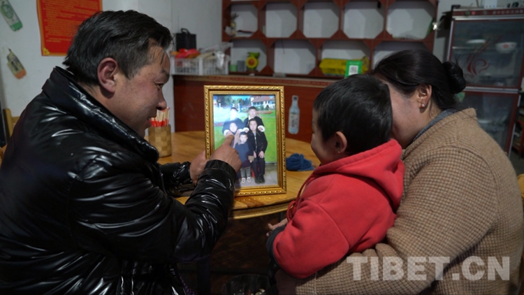 圖為民族團結(jié)家庭趙以存給小兒子看一家五口的全家福