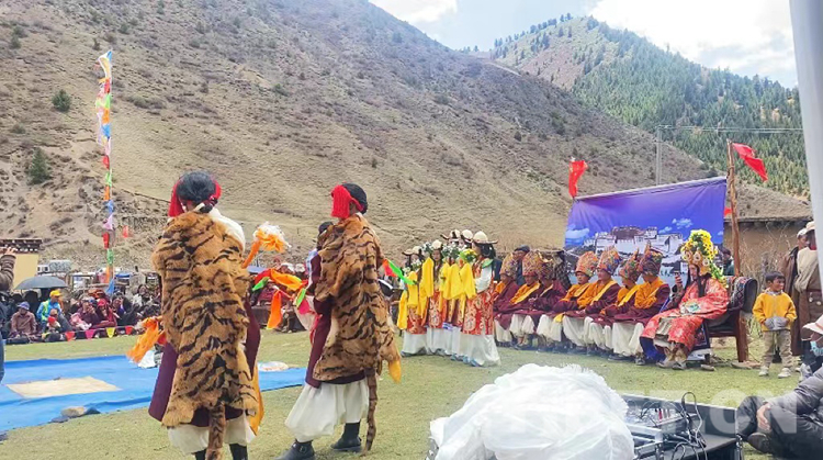 此次《諾桑王子》的表演劇本,由演員們自發(fā)組織創(chuàng)作,保留了古老的唱腔藝術(shù)和服飾藝術(shù),在原創(chuàng)基礎(chǔ)上,添加了折嘎、昌都鍋莊、康巴特色體育競技等內(nèi)容。在保護與創(chuàng)新中傳承,造就了這座村落獨特的藏戲文化。