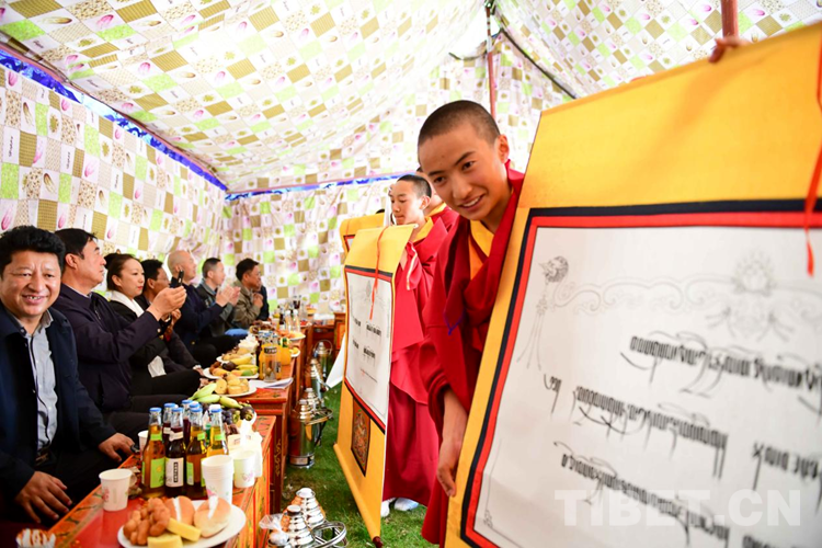 圖為佛學(xué)院老師代表相關(guān)單位向少年活佛贈(zèng)送節(jié)日禮物 攝影:拉姆