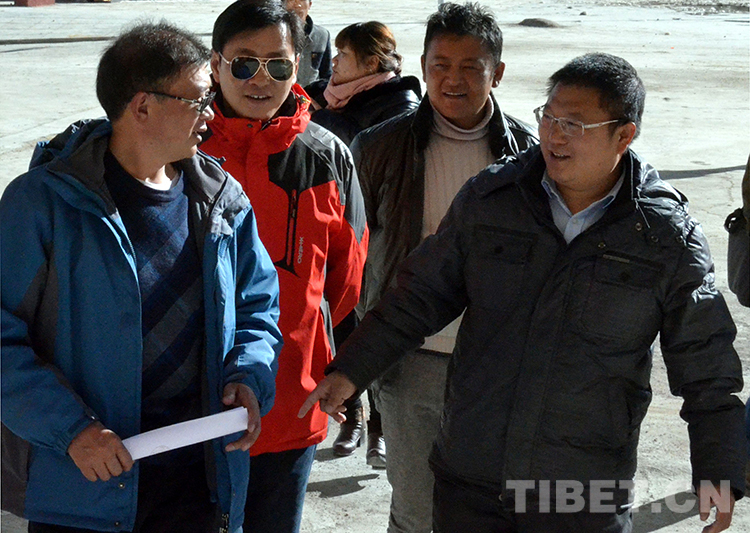 這是中國石化援藏干部王鵬雁(右一)在中國石化小學(xué)二期工程驗收現(xiàn)場同其他縣領(lǐng)導(dǎo)進行交流(扎西2014年10月25日攝)