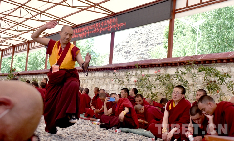圖為6月21日下午,中國藏語系高級(jí)佛學(xué)院2022級(jí)“拓然巴”高級(jí)學(xué)銜班招生考試西藏考點(diǎn)現(xiàn)場(chǎng),考僧正在互辯。攝影:王媛媛