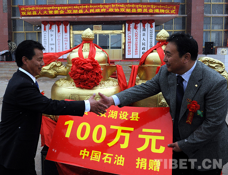 這是對(duì)口援助單位的中國石油為雙湖設(shè)縣捐贈(zèng)100萬元。經(jīng)國務(wù)院批準(zhǔn),2013年7月26日,雙湖特別區(qū)“撤區(qū)建縣”正式掛牌(唐召明2013年7月26日攝)