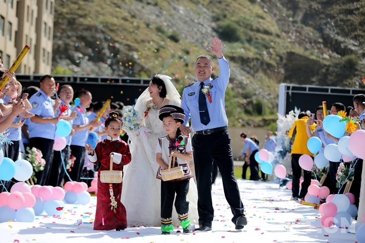 戍守邊境是使命,與相濡以沫的另一半攜手戍邊則成了最特別的浪漫。在婚禮現(xiàn)場,有一對穿著彝族和藏族服飾的花童引人注目?;ㄍ砗蟮男吕珊挠钍菑脑氐搅舨氐囊妥迕窬?,而新娘次旦央宗則是土生土長的藏族民警。這對“新人”的聯(lián)姻,既體現(xiàn)了民族團(tuán)結(jié)與融合,更展示了西藏移民管理警察扎根奉獻(xiàn)邊疆的誓言和決心。