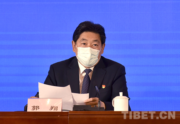 圖為西藏自治區(qū)新型冠狀病毒肺炎疫情防控工作第四場新聞發(fā)布會(huì)上,西藏自治區(qū)經(jīng)濟(jì)和信息化廳黨組成員、副廳長、一級巡視員郭翔介紹疫情期間防疫物資保障情況 攝影:王媛媛